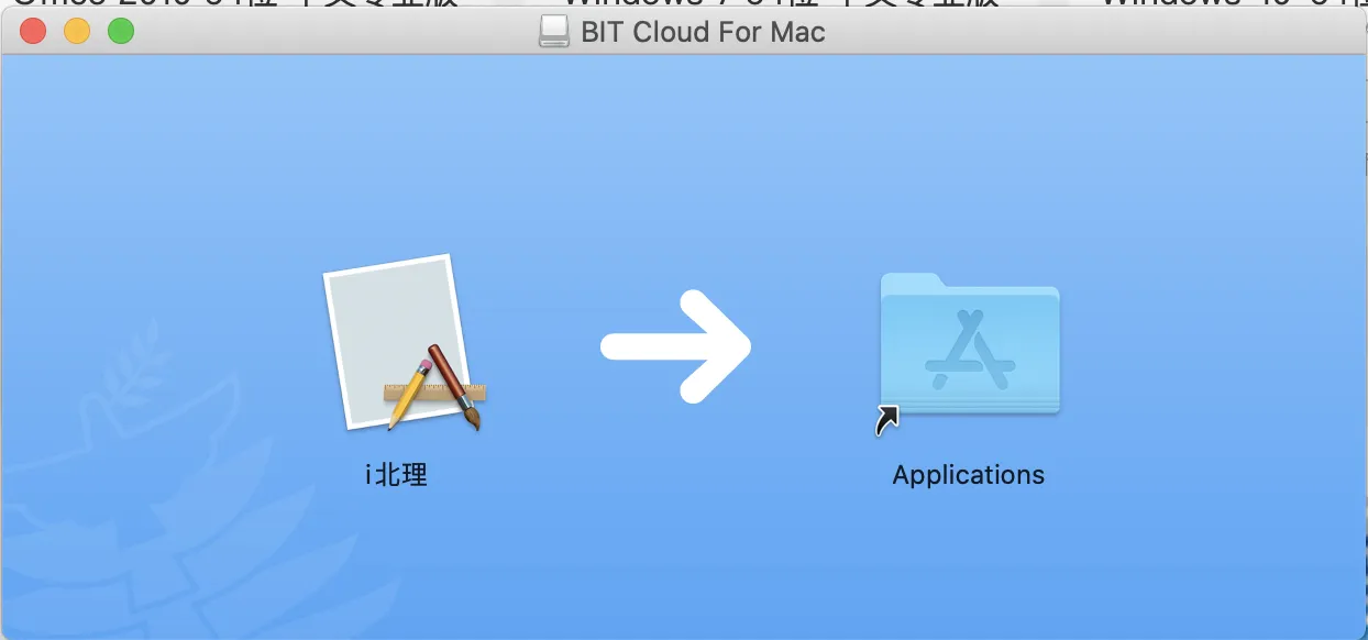 macOS客户端下载后,点击下载的.dmg文件进行检查后,出现如下窗口,将i北理拖拽到Applications中即可。