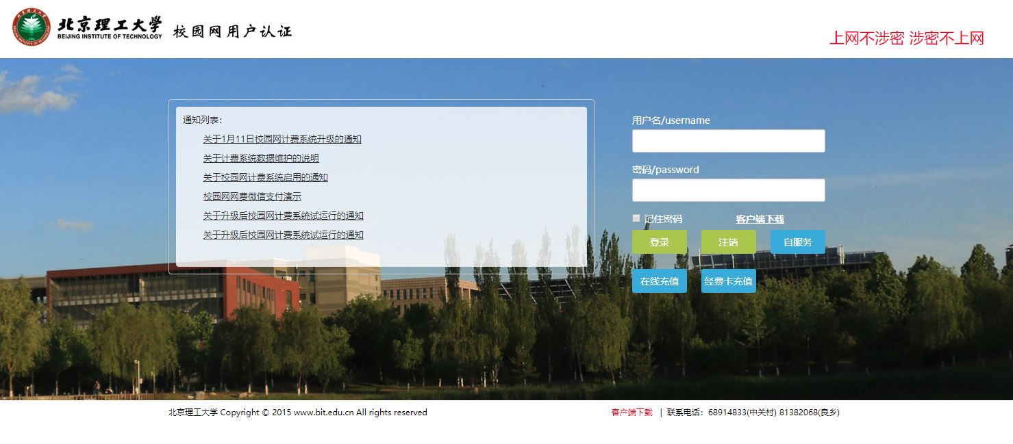 针对于BIT-Web,用户在连接上无线网以后,需要打开浏览器进入校园网用户认证界面并输入账号以及密码进行认证,界面如下: